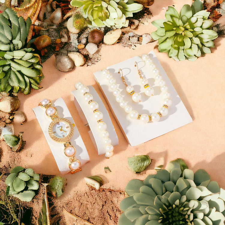 ست ساعت مچی و زیورآلات مرواریدی لوکس و جذاب